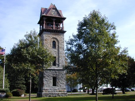 The clock tower almost at the road and to the left.